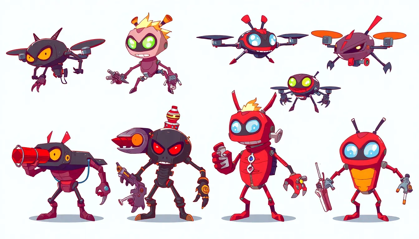 Drones exhibit sharp angles and sleek forms, emphasizing their mechanical nature. Bold colors, including blacks, reds, and metallic hues create striking visuals. Designers often highlight expressive eyes that convey emotion and personality. Unique weaponry and accessories add depth, showcasing individuality among characters. Each drone’s design reflects its role within the series, balancing menacing traits with comedic elements.